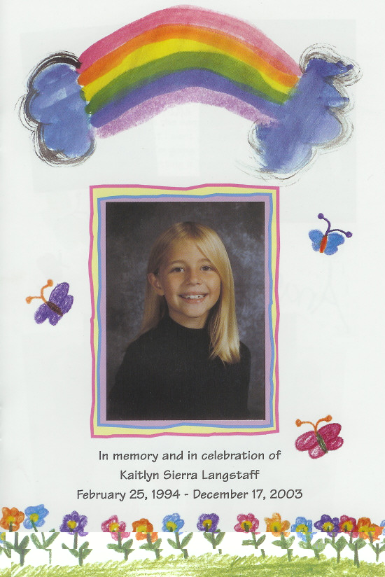 We held a public memorial service for Kaitlyn on Saturday, January 17 at WestGate Church in San Jose, CA. This event was a celebration of Kaitlyn's life. We had live music, a slide presentation, children's stories, special speakers, a butterfly and balloon release and more. More than 500 people attended the event. Download the complete program for the service. Kaitlyn’s Memorial Service