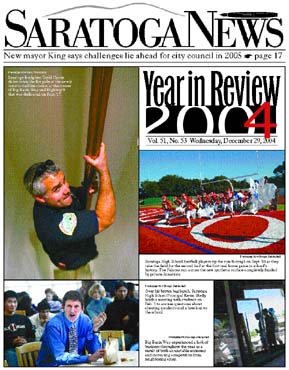 It's '04 No More: The Year in Review By Kaustuv Basu and Lisa Toth As ol' Father Time drags away 2004 to make way for 2005, so too does the city of Saratoga look ahead to a new year with optimism and enthusiasm. But before popping the cork to welcome in 2005, it's important to reflect on the passing of 2004—a year to remember in Saratoga. It was a year when the county sheriff's department decided that its facility in the city was too small and opted to leave to take up new residence in nearby Cupertino. But it was also a year when the city's firefighters moved into a brand new, state-of-the-art facility with the completion of their impressive building at the corner of Big Basin Way and SaratogaLos Gatos Road.